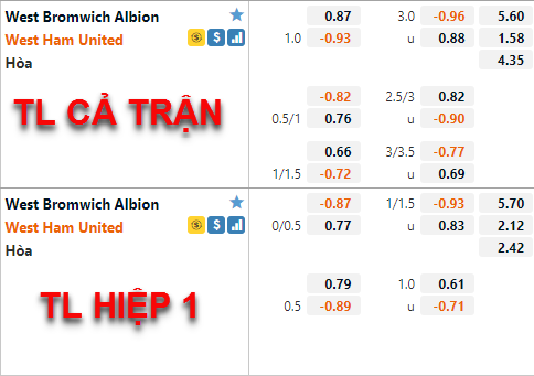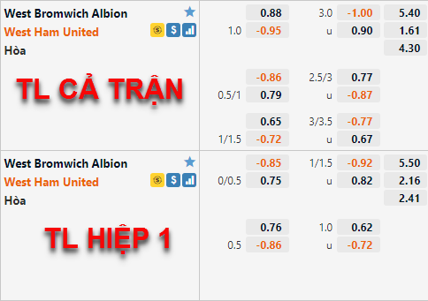 Có thể thấy giới đầu tư đang khó phán đoán kinh bản cửa trận đấu này. Giai đoạn gần đấy West Ham có dấu hiệu sa sút một cách khó hiểu nhưng hiện tại họ vẫn đang còn cơ hội cạnh tranh vị trí tham dự Europa League, chắc chắn các cầu thủ West Ham sẽ còn có động lực hơn khi đối thủ cạnh tranh trực tiếp với họ là Tottenham đang bị Aston Villa dẫn trước ngay trên sân nhà. Nêu chiến thắng trận này West Ham sẽ vươn lên vị trí thứ 6, với lực lượng hiện tại việc có một chiến thắng thuyết phục trước West Brom không phải là điều quá khó với đội khách.