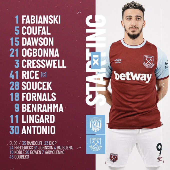 West Ham: Fabianski; Coufal, Dawson, Ogbonna, Cresswell; Soucek, Rice; Bowen, Lingard, Benrahma; Antonio