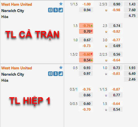 Tỷ lệ trận đấu đã có nhiều biến động so với lần chúng tôi cập nhật trước đây. Hiện tại mức chấp 1 1/4 của West Ham đã là mức chấp chính của trận đấu thay cho mức 1 1/2 ở lần cập nhật trước. Bên phía tỷ lệ tài xỉu có ít thay đổi hơn khi mốc 2 3/4 vẫn được duy trì là mốc chính của trận đấu và điểm ăn của cửa tài đã được điều chỉnh tăng đôi chút so với trước đây.