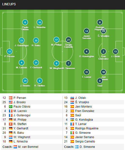 - Atletico Madrid (4-4-2): Jan Oblak - Mario Hermoso, Stefan Savic, Antonio Moya, Sime Vrsaljko - Thomas Lemar, Saul, German Valera, Victor Mollejo - Sergio Camello, Giuliano Simeone