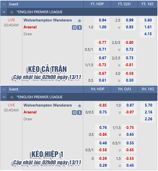 * Chốt kèo trận Wolves vs Arsenal (02h45 ngày 13/11)