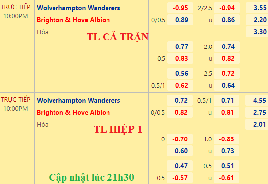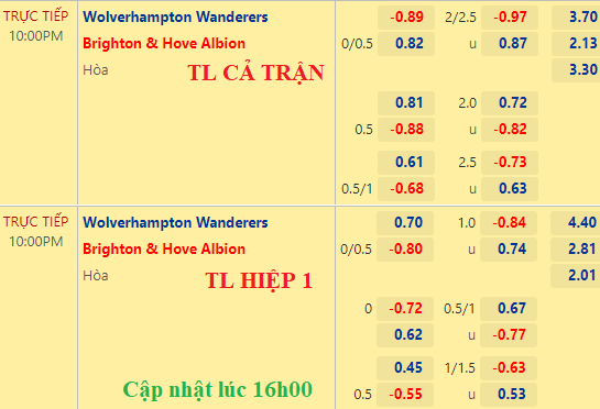Trên sàn châu Á, Brighton vẫn chấp 1/4 với điểm ăn thấp hơn cửa chủ nhà, còn tài xỉu vẫn là 2 1/4. Dịch chuyển handicap chưa có gì đáng kể và với tỷ lệ như vậy, lựa chọn xỉu được xem là tối ưu nhất.