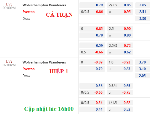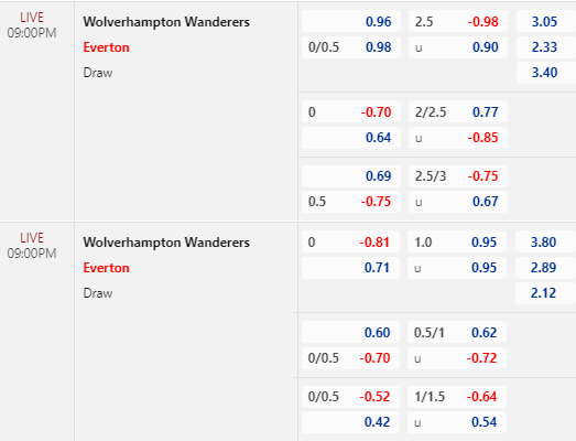 Sàn châu Á ghi nhận đà tăng giá của Everton khi họ lên chấp đồng banh cân tiền, kéo theo đó thì tài xỉu cũng nhích lên mức 2 1/2. Dịch chuyển như vậy là khả quan với Everton, trong bối cảnh chủ nhà Wolves đã hết động lực.