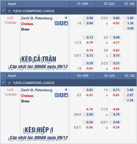 AEGoal chốt kèo bóng đá trực tiếp trận Zenit vs Chelsea diễn ra lúc 00h45 ngày 09/12 trong khuôn khổ vòng bảng Cúp C1 Châu Âu sau khi dựa trên tính toán, chuyển động về kèo châu Á và đội hình ra sân của 2 đội.