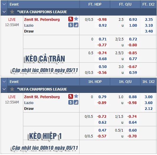 AEGoal chốt kèo bóng đá trực tiếp trận Zenit vs Lazio diễn ra lúc 00h55 ngày 05/11 trong khuôn khổ UEFA Champions League sau khi dựa trên tính toán, chuyển động về kèo châu Á và đội hình ra sân của 2 đội.