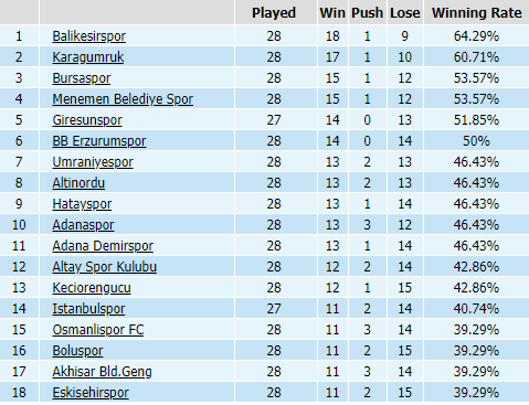Một CLB khá tên tuổi là Akhisar dù có vị trí thứ 5 trên BXH tổng nhưng trên khía cạnh chỉ số châu Á, CLB này đứng áp chót với tỷ lệ thắng kèo chỉ 39,29%, bằng với đội bét bảng là Eskisehirspor. Eskisehirspor không chỉ đứng cuối cùng về điểm số mà đội bóng này cũng không đáng tin với giới đầu tư. Trong 28 trận đã đấu thì Eskisehirspor có tới 15 lần khiến giới mộ điệu thất vọng.
