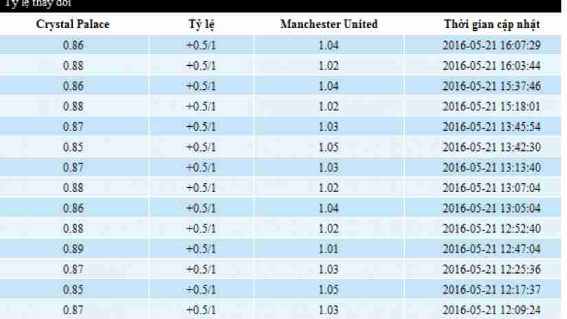 Đến cuối phiên giao dịch hôm nay, chỉ số chính ở trận chung kết Cúp FA giữa MU và Crystal Palace đã điều chỉnh giảm xuống còn 0:1/2 nghiêng về phía đoàn quân của HLV Van Gaal. Nếu so sánh với thời điểm bắt đầu xuất hiện trên thị trường, MU chứng kiến giảm hơn 1/4 quả bóng và đây là mức điều chỉnh bất lợi rất lớn và đáng lo ngại cho giới đầu tư. Với dịch chuyển nói trên, MU đương nhiên không phải kênh đầu tư đáng tin cậy khi Crystal Palace là đối thủ rất khó chịu.