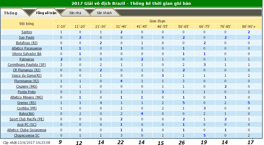 Ở bảng thống kê bên dưới, có thể thấy trong khoảng thời gian từ phút thứ 56-65 là quãng thời gian mà các thủ thành phải vào lưới nhặt bóng nhiều nhất. Kế đến là quãng thời gian từ phút thứ 31-40 xuất hiện 22 lần lưới rung.