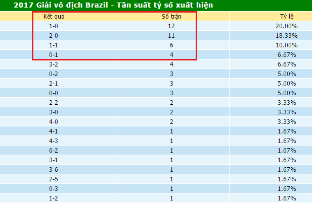 Nhìn vào bảng thống kê tài/xỉu dưới đây, có thể thấy số trận có từ 2 bàn thắng trở xuống đang chiếm phần lớn. 6 vòng đấu với 60 trận đã diễn ra nhưng có tới 39 trận trong số đó kết thúc với tối đa chỉ 2 lần lưới rung (tỷ lệ đạt 65%), tức là có gần 2/3 số trận có từ 2 bàn trở xuống. Điều đó đồng nghĩa với việc xỉu đang xuất hiện nhiều tại giải VĐQG Brazil.