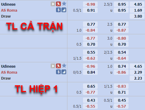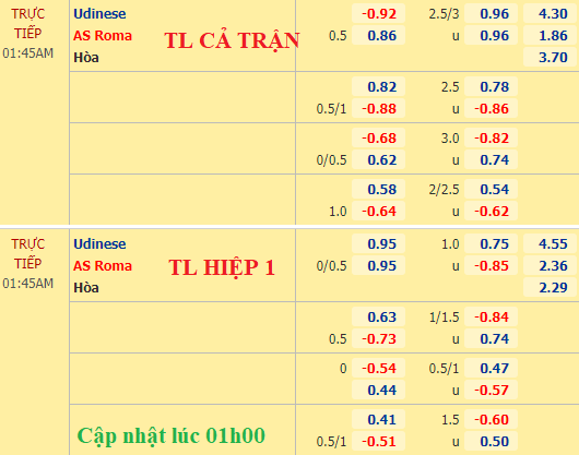AEGoal.net chốt kèo bóng đá trực tiếp trận Udinese vs AS Roma diễn ra lúc 01h45 ngày 04/10 trong khuôn khổ giải VĐQG Italia sau khi dựa trên tính toán, chuyển động về kèo châu Á và đội hình ra sân của 2 đội.
