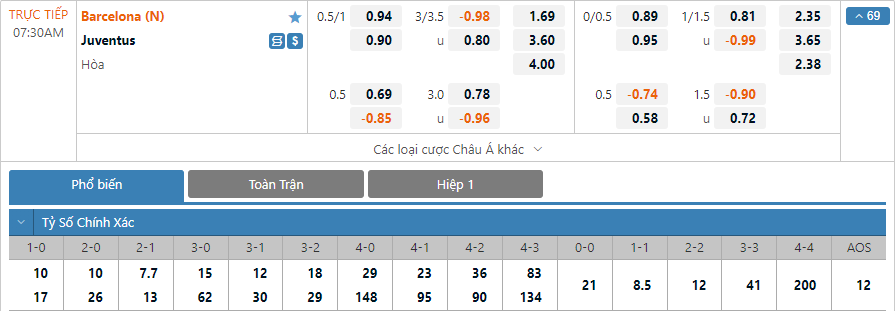 Ở bảng kèo tỷ số chính xác tỷ số 2-1 đang có điểm ăn thấp nhất với 7.7 lần, tiếp theo là tỷ số 1-1 cũng điểm ăn không quá chênh lệch với 8.5 lần. Trong khi tỷ số 1-0 và 2-0 có cùng điểm ăn là 10 lần. Với dự đoán Barcelona sẽ gặp khó khăn và trận đấu không có nhiều bàn thắng thì lựa chọn tỷ số 1-1 sẽ là một lựa chọn hợp lý nhất trận này.