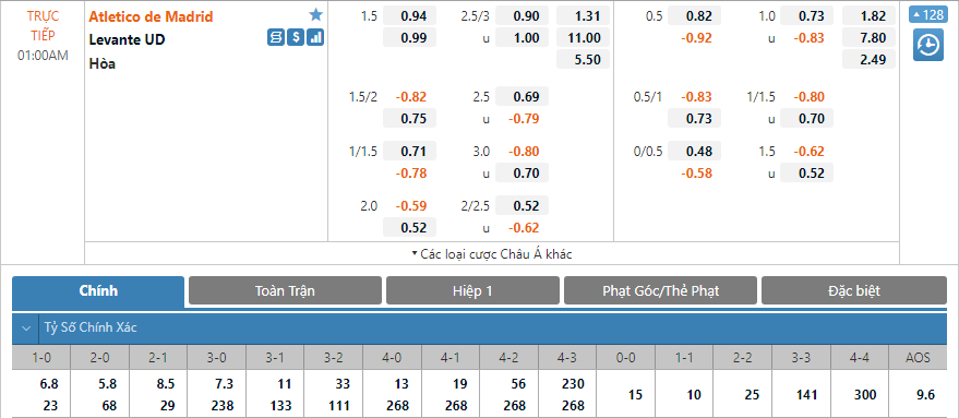 Trên bảng kèo tỷ số chính xác của trận đấu, tỷ số 2-0 đang có điểm ăn thấp nhất với 5.8 lần, tỷ số 1-0 tiếp theo với mức ăn 6.8. Tỷ số 3-0 cũng có điểm ăn không quá chênh lệch với 7.3, với dự đoán Atletico Madrid sẽ có một trận thắng dễ dàng với kịch bàn nhiều bàn thắng thì lựa chọn tỷ số 3-0 hoặc 3-1 sẽ là lựa chọn hợp lý trận này.