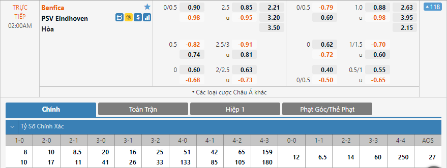 Ở bảng tỷ số chính xác của trận đấu, hiện tại tỷ số có điểm ăn ít nhất là 1-1 với 6.5 lần, tiếp theo là tỷ số 1-0 và 2-1 lần lượt có điểm ăn là 8 và 8.5 lần. Mốc tỷ số nghiêng về phía PSV có điểm ăn thấp nhất là 0-1 với 10 lần. Có thể thấy nhà cái đang nghiêng về kết quả hòa cho trận đấu này. Với dự đoán trận đấu khó diễn ra sôi nổi và PSV sẽ tạo ra nhiều khó khăn cho Benfica thì lựa chọn tỷ số 1-1 hoặc 0-1 có thể sẽ là lựa chọn tốt cho trận đấu này.