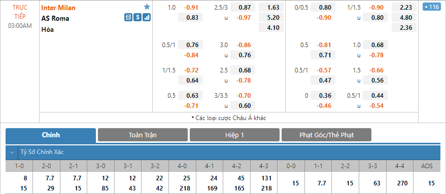 Ở bảng kèo tỷ số chính xác của trận đấu tỷ số 2-0, 2-1 và 1-1 đang có điểm ăn thấp nhất với cùng mức là 7.7 lần. Điều này cho thấy giới chuyên môn cũng không mấy tin tưởng và khả năng vượt kèo của Inter Milan. Tỷ số 1-0 tiếp có điểm ăn không mấy cách biệt là 8 lần. Với dự đoán Inter Milan sẽ giành chiến thắng nhưng không phải là một chiến thắng dễ dàng thì lựa chọn tỷ số 2-1 hoặc 1-1 sẽ là phương án hợp lý cho trận đấu này.