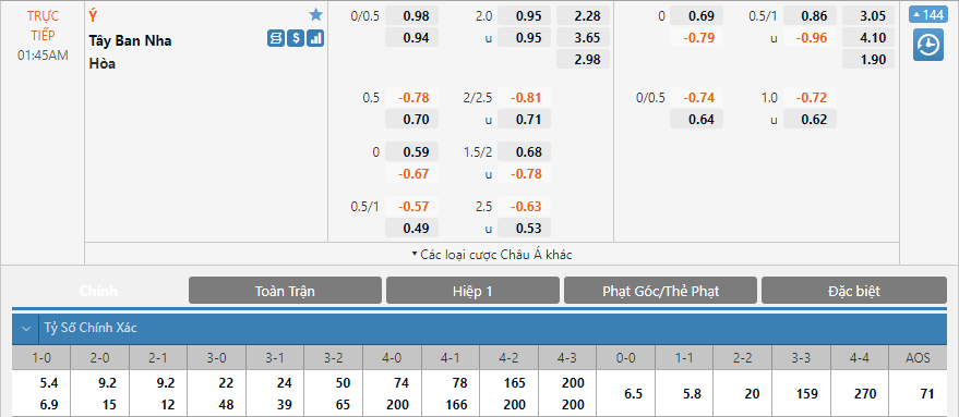 Ở bảng kèo tỷ số chính xác của trận đấu. Tỷ số có mức điểm ăn thấp nhất là tỷ số 1-0 với 5.4 lần, tiếp theo là 2 tỷ số hòa 0-0 và 1-1 có điểm ăn lần lượt là 6.5 lần và 5.8 lần. Tỷ số nghiêng về phía ĐT Tây Ban Nha có điểm ăn thấp nhất là tỷ số 0-1 với 6.9 lần. Với dự đoán trận đấu sẽ kho phần thắng bại trong 90 phút thi đấu chính thức và thế trận cũng ít có khả năng diên ra sôi nổi thì lựa chọn tỷ số hòa 0-0 hoặc 1-1 sẽ là một lựa chọn tốt cho trận đấu đấu này.
