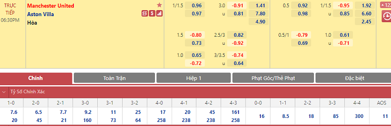 Tỷ lệ và điểm ăn các tỷ số chính xác trận Man Utd vs Aston Villa
