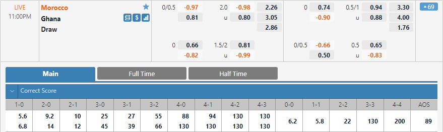 Tỷ lệ tài xỉu của trận đấu đang được nhà cái châu Á công khai ở mức 2 hoà và điểm ăn ít bên phía cửa xỉu. Có thể thấy giới chuyên môn đang dự đoán trận đấu sẽ khó diễn ra cởi mở với nhiều bàn thắng được ghi. Điều này hoàn toàn hợp lý với mặc dù Morocco được đánh giá cao hơn đối thủ nhưng thực tế họ lực lượng của đội bóng bắc phi chỉ tương đồng với Ghana, họ khó có thể áp đặt một thể trận thuận lợi trận này. Mặt khác, hai đối thủ còn lại của bảng C được đánh giá yếu hơn nhiều khả năng cả 2 đội sẽ không bung toàn sức lực cho trận đấu này bởi họ chỉ cần giành chiến thắng ở 2 trận đấu là đủ để vượt qua vòng bảng.