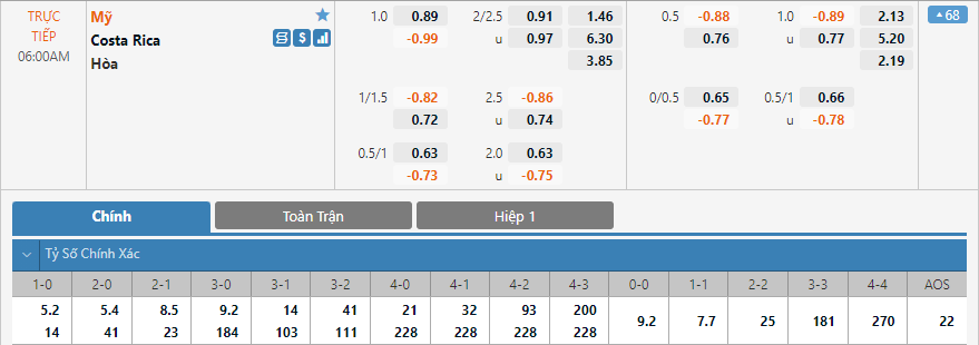 Ở bảng kèo tỷ số chính xác của trận đấu tỷ số 1-0 và 2-0 đang được nhà cái ưu tiên nhất khi có điểm mức điểm ăn rất thấp là 5.2 và 5.4 lần, mức tỷ số có điểm ăn thấp tiếp là 1-1 cũng tới 7.7. Với dự đoán ĐT Mỹ đủ khả năng giành 3 điểm nhưng không quá dễ dàng thì lựa chọn tỷ số 1-0 hoặc 2-0 sẽ là lựa chọn tối ưu trận này.