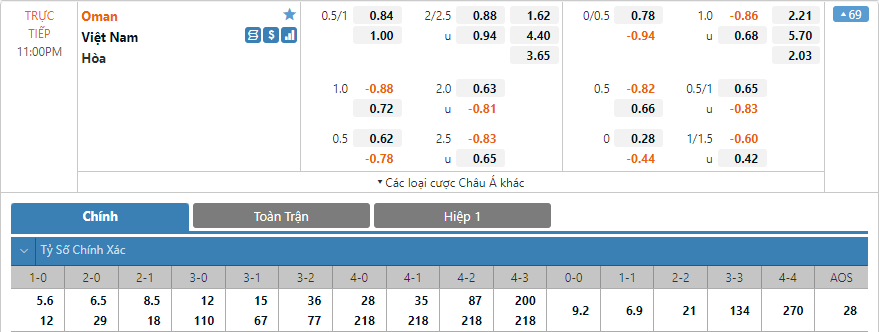 Ở bảng kèo tỷ số chính xác của trận đấu tỷ số 1-0 đang có điểm ăn thấp nhất với 5.6 lần. Tiếp theo là tỷ số 2-0 với 6.5 lần nhưng mức điểm ăn của tỷ số 1-1 cũng không quá chênh lệch với 6.9. Tỷ số được nhà cái ưu tiên tiếp theo là tỷ số 2-1 với 8.5 lần. Với dự đoán Oman sẽ không có một trận đấu dễ dàng thì lựa chọn tỷ số 1-1 hoặc 2-1 sẽ là lựa chọn tốt.
