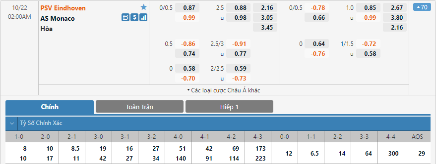 Tỷ lệ chấp 1/4 của PSV trận này không có gì bất thường khi lực lượng hiện tại của hai đội không có nhiều chênh lệch trong khi đội bóng Hà Lan có lợi thế sân nhà. Hiện tại PSV có thành tích không tồi ở giải quốc nổi với lối chơi cởi mở, nhưng nếu tính trên sàn giao dịch châu Á thì họ đã gây thất vọng khi thua kèo tới 5 lần trong 6 trận đấu gần nhất. Nhưng điểm đáng chú ý là các trận đấu của PSV từ đấu mùa đều diễn ra rất sôi nổi với nhiều bàn thắng được ghi.