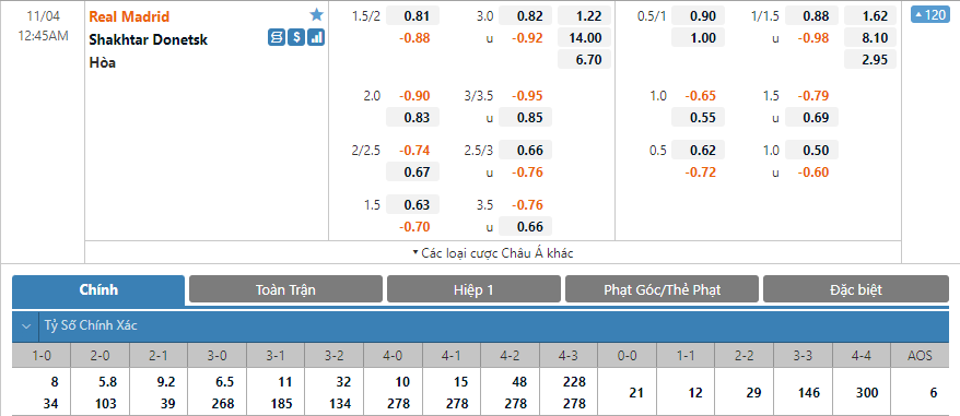 Ở bảng kèo tỷ số chính xác của trận đấu tỷ số 2-0 đang có điểm ăn thấp nhất với 5.8 lần, tiếp theo là tỷ số 3-0 với 6.5 lần. Có thể thấy giới chuyên môn cũng đang tin tưởng vào khả năng thắng kèo của Real Madrid trận này.Với dự đoán Shakhtar Donetsk khó ghi bàn trận này thì lựa chọn tỷ số 3-0 hoặc 2-0 có thể là một lựa chọn hợp lý.