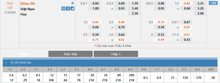 Trên sàn giao dịch châu Á hiện tại ĐT Trung Quốc đang có tỷ lệ chấp 3/4 cho trận đấu này. Đây là mức tỷ lệ chấp hoàn toàn hợp lý khi ĐT Trung Quốc có chất lượng đội hình tốt hơn Việt Nam. Ở 3 lần đối đầu gần nhất thì Trung Quốc cũng hoàn toàn chiếm ưu thế khi thắng cả 3 trận. Tỷ lệ tài xỉu của trận đấu đang được duy trì ở mức 2 1/4, đây là mức tương đối thấp. Điều này cho thấy giới chuyên môn đang dự đoán trận đấu khó diễn ra sôi nổi.