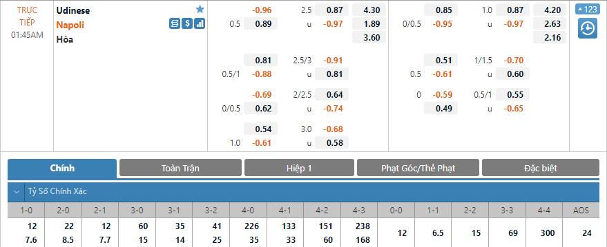 Ở kèo tỷ số chính xác của trận đấu tỷ số 1-1 đang có điểm ăn thấp nhất với 6.9 lần. Tiếp theo là tỷ số 0-1 và 1-2 có điểm ăn lần lượt là 7.6 lần và 7.7 lần. Với dự đoán Napoli sẽ không có một trận đấu dễ dàng và trận đấu nhiều khả năng diễn ra sôi nổi thì lựa chọn tỷ số 1-2 hoặc 1-1 sẽ là lựa chọn tốt cho trận đấu này.