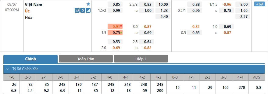 Ở bảng kèo tỷ số chính xác của trận đấu tỷ số 0-2 đang có điểm ăn thất nhất với 5.4 lần. Tiếp theo là các tỷ số 0-1 và 0-3 có điểm ăn lần lượt là 6.8 và 6.9 lần. Tỷ số có lợi cho ĐT Việt Nam có điểm ăn thấp nhất là tỷ số 1-1 với 11 lần và tỷ số ĐT Việt Nam có bàn thắng có điểm ăn thấp nhất là 1-2 với 9.2 lần. Với dự đoán ĐT Australia không có một chiến thắng dễ dàng và khả năng Việt Nam có bàn thắng thì lựa chọn tỷ số 0-2 hoặc 1-2 sẽ là lựa chọn tốt cho trận đấu này.