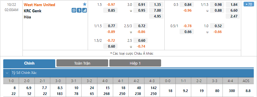 Bảng kèo tỷ số chính xác của trận đấu, tỷ số 2-0 đang có điểm ăn thấp nhất với 6.9 lần. Tiếp theo là tỷ số 2-1 và 1-0 với điểm ăn lần lượt là 7.7 và 8 lần. Nhưng mức tỷ số 3-1 cũng không có điểm ăn quá chênh lệch là 8.5 lần. Với dự đoán West Ham thắng kèo và trận đấu diễn ra với một thế trận cởi mở thì lựa chọn tỷ số 2-0 hoặc 3-1 sẽ là lựa chọn tốt.