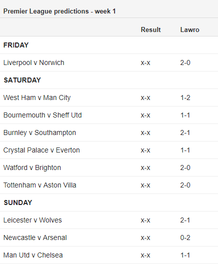 Cùng chuyên gia hàng đầu của BBC, Mark Lawrenson dự đoán kết quả các trận đấu thuộc vòng 1 giải Ngoại hạng Anh, Premier League.