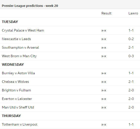 Cùng chuyên gia hàng đầu của BBC - Mark Lawrenson dự đoán kết quả các trận đấu thuộc vòng 20 giải Ngoại hạng Anh - Premier League.