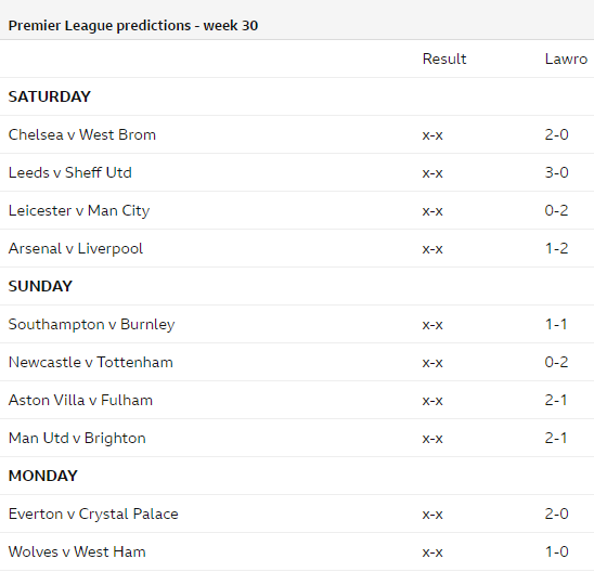 Cùng chuyên gia hàng đầu của BBC - Mark Lawrenson dự đoán kết quả các trận đấu thuộc vòng 30 giải Ngoại hạng Anh - Premier League.