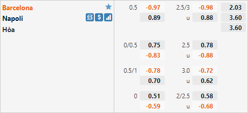 Cơ sở: Mức chấp 1/2 của Barcelona trận này là mức chấp rất thấp so với lần đối đầu tương tự gần nhất của hai đội tại Champions League diễn ra năm 2020, ở trận đấu đó Barca có mức chấp tới 1 hoà và dễ dàng vượt kèo với chiến thắng 3-1. Việc điểm ăn của Napoli liên tiếp giảm kể từ khi tỷ lệ được công khai trên sàn giao dịch cũng là một điểm trừ cho đội chủ nhà. Trong khi đó Napoli đang có thành tích rất tốt trên sân khách với 4 trận thắng kèo liên tiếp.