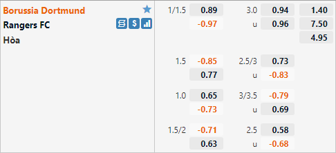 Cơ sở: Dortmund đang có kết quả tương đối ổn định trên sân nhà với hàng công thi đấu bùng nổ, đại diện Đức ghi tới 15 bàn thắng ở 4 trận sân nhà gần nhất. Lối chơi của Dortmund thường gặp khó khăn khi phải đối đầu với nhưng đối thủ thi đấu chặt chẽ nhưng Rangers cũng là một đội bóng có lối chơi cởi mở. Rõ ràng với lực lượng vượt trội và lợi thế sân nhà Dortmund có nhiều cơ hội thắng kèo trận này.