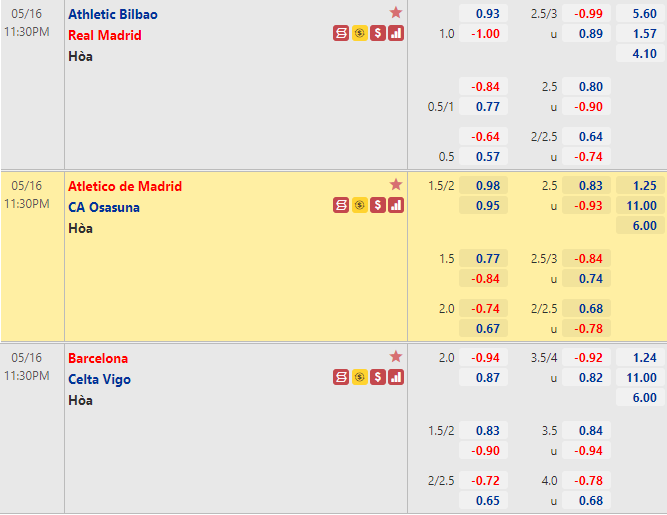 Còn với Barcelona, vòng này họ được thi đấu tại Camp Nou để đón tiếp Celta Vigo. Trước đối phương đã toàn thắng 4 vòng gần đây, việc Barca chấp 2 hòa trận này là tỷ lệ tương đối khả quan. Nên nhớ lần mới nhất tiếp Celta Vigo tại Camp Nou, Barca chỉ chấp có 1 3/4 mà thôi. Nhìn chung thì khả năng Atletico Madrid và Barca thắng vòng này là rất cao, trong khi đội có nguy cơ sảy chân chính là ĐKVĐ Real Madrid.