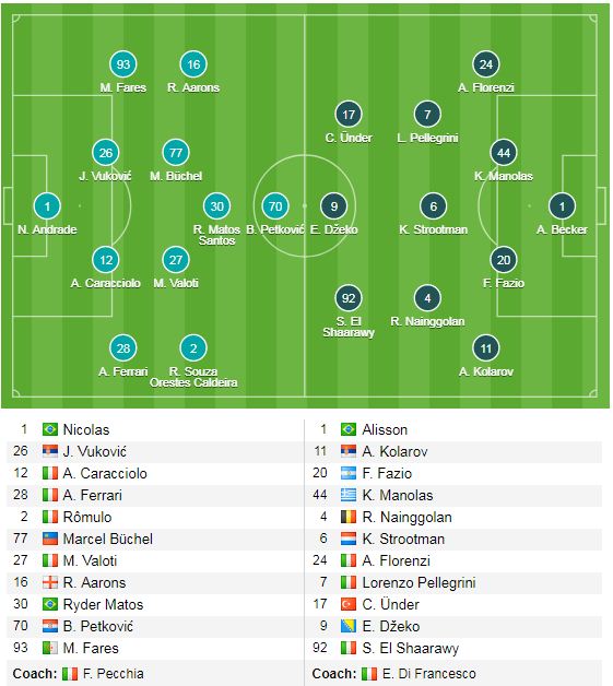 Trước 1 đối thủ mạnh, lại không có sự phục vụ của tiền đạo chủ lực Moise Kean, Verona đã không giấu diếm ý đồ chơi chắc chắn để kiếm 1 điểm trước AS Roma khi ra sân bằng sơ đồ 4-4-1-1. Trong khi đó, dù ra sân với đội hình tấn công quen thuộc 4-3-3 thế nhưng với phong độ nghèo nàn từ hàng công trong thời gian qua, AS Roma cũng không hề đáng tin cho 1 thế trận bùng nổ tấn công, chưa kể việc Di Francesco lại không có sự phục vụ ngay từ đầu của Perotti và Gerson cũng ảnh hưởng không nhỏ tới sức tấn công của đội bóng này.