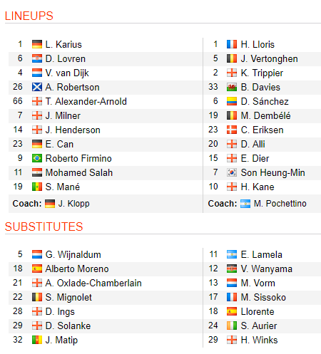 Cả 2 đội đều tung vào sân đội hình bao gồm những nhân tố tốt nhất của mình, bên phía Liverpool là bộ ba Salah, Firmino, Mane còn bên phía Tottenham là Kane, Alli, Eriksen... Với đội hình ra sân như vậy, cả 2 chiến lược gia Klopp và Pochettino đều không giấu diếm ý đồ chơi tấn công.