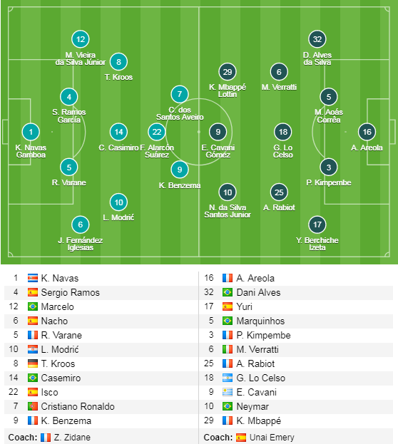 Hai đội không có những thay đổi nào quá lớn ở đội hình xuất phát, vẫn là những cái tên quen thuộc. Bên phía chủ nhà Real là Modric, Kroos, Ronaldo, Benzema, trong khi phía đội khách PSG có Mbappe, Neymar, Cavani, Veratti hay Rabiot.