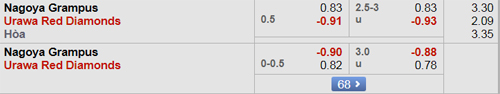Trong 4 cuộc đụng độ Nagoya gần nhất ở J-League 1, Urawa Reds đã có tới 4 chiến thắng. Tuy nhiên, ở màn tái ngộ chiều nay, Urawa Reds lại chỉ được xếp ở cửa trên với tỷ lệ 1/2:0. Đây là tỷ lệ khiêm tốn nếu biết rằng mùa trước, họ từng chấp 3/4:0 khi làm khách trước