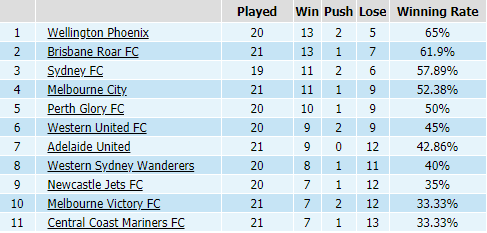 AEGoal gửi tới NHM bảng xếp hạng tỷ lệ thắng kèo của giải VĐQG Australia để xem cái tên nào đáng tin nhất với các nhà đầu tư.