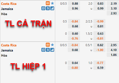 Costa Rica cũng có tỷ lệ chấp 1/4 ở kèo hiệp 1 nhưng điểm ăn của cửa trên bỏ rất sâu, tỷ lệ thứ 2 được nhà cái châu Á công khai là 0:0 nhưng ăn của Costa Rica lại rất thấp. Có thể thấy đấy là 2 mức tỷ lệ khó chọn lựa nhưng là hợp lý so với tính của trận đấu này. Hai đội chắc chắn sẽ nhập cuộc một cách thận trọng khi đều có mục giành chiến thắng nhưng cũng phải bảo toàn lực lượng cho các trận đấu tiếp theo.