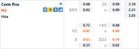 Trên sàn giao dịch châu Á hiện tại, mặc dù phải thi đấu trên sân khách nhưng đội tuyển Mỹ vẫn được giới chuyên môn đáng giá cao hơn với tỷ lệ chấp 1/4 cho trận đấu này. Mức chấp này cho thấy nhà cái đang đánh giá rất cao đội tuyển Mỹ bởi 4 lần làm khách gần nhất của Costa Rica đội bóng xứ sở cờ hoa đều bị đánh giá thấp hơn đối thủ.