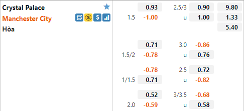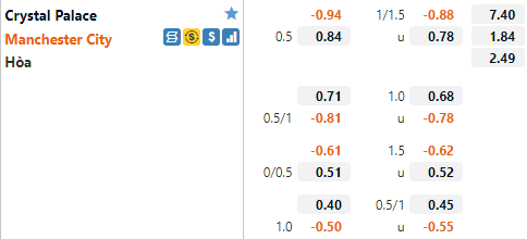 Tỷ lệ chấp của Man City trong hiệp 1 trận đấu đang được nhà cái công khai ở mức 1/2. Mức tỷ lệ chấp 1/2 trong 45 phút đầu tiên của trận đấu là tương đối thấp khi Man xanh đang có tỷ lệ chấp 1 1/2 cả trận. Điều này cho thấy giới chuyên môn dự đoán Crystal Palace sẽ tạo ra một số khó khăn cho đội khách ở 45 phút thi đấu đấu tiên.