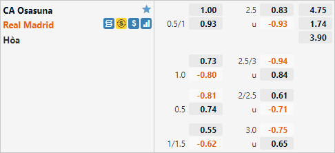 Real Madrid đang được nhà cái châu Á đánh giá ở cửa trên với tỷ lệ chấp 3/4 trên sàn giao dịch. Đây là mức chấp tương đối thấp của đội khách, ở 2 lần làm khách gần nhất của Osasuna đội bóng hoàng gia đều có tỷ lệ chấp 1 hoà. Nhưng mức chấp này không vô lý khi Real Madrid có trận đấu khó khăn trong khuôn khổ vòng bán kết Champions League vào tuần sau, chắc chắn họ sẽ cần những tính toàn về mặt lực lượng và không thể thi đấu hết sức cho trận đấu này.