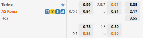 Trên sàn giao dịch châu Á hiện tại AS Roma đang được nhà cái đánh giá ở cửa trên với tỷ lệ chấp 1/4 trận này. Ở trận đấu tương tự của mùa giải trước đội bóng thành Roma cũng có tỷ lệ chấp 1/4 nhưng họ đã gây thất vọng khi ra về với trận thua 1-3. Nhưng AS Roma vẫn là đội bóng chiếm ưu thế trong quá khứ đối đầu khi thắng 3/4 lần làm khách của Torino gần nhất.