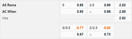Hiện tại nhà cái cũng đang đánh giá khả năng của hai đội tương đối cân bằng với mức tỷ lệ 0:0 trên sàn giao dịch châu Á. Có thể thấy AS Roma đã bị đánh giá thấp hơn so với trận đấu tương tự của mùa giải trước bởi họ đã có tỷ lệ chấp 1/4 khi tiếp đón AC Milan vào thời điểm cuối năm 2021.