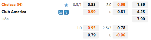 Trên sàn giao dịch hiện tại Chelsea đang được đánh giá ở cửa trên với tỷ lệ chấp 3/4 và mức điểm ăn tương đối cân bằng. Có thể thấy mức chấp này là tương đối thấp nếu so sánh về thực lực của hai đội lúc này. Chelsea và Club America đã từng đối đầu 2 lần trong năm 2007 và 2009 đều trong khuôn khổ giao hữu, đội bóng Anh đều có tỷ lệ chấp 1 hoà và cũng giành thắng lợi ở cả 2 trận đấu