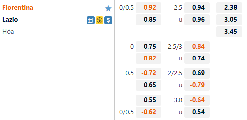 Hiện tại Fiorentina được nhà cái đánh giá ở cửa trên với tỷ lệ chấp 1/4 nhưng với mức điểm ăn bỏ trên sàn giao dịch châu Á. Trận đấu tương tự gần nhất Viola cũng có tỷ lệ chấp 1/4 nhưng đã gây thất vọng khi thua tới 3 bàn không gỡ. Lazio cũng là đội chiếm ưu thế trong những cuộc đối đầu gần đây khi thắng tới 4/5 trận gần nhất.