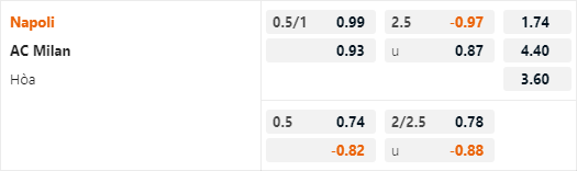 Với lợi thế sân nhà các cầu thủ Napoli đang được nhà cái đánh giá ở cửa trên với tỷ lệ chấp 3/4 và mức điểm ăn tương đối cân bằng ở 2 cửa. Đây là mức chấp cao nhất của Napoli so với 4 lần gần nhất tiếp đón AC Milan. Mặc dù luôn được đánh giá ở cửa trên nhưng Napoli gặp rất nhiều khó khăn khi đối đầu với AC Milan trên sân nhà, họ đã thua kèo châu Á cả 4 trận gần nhất.