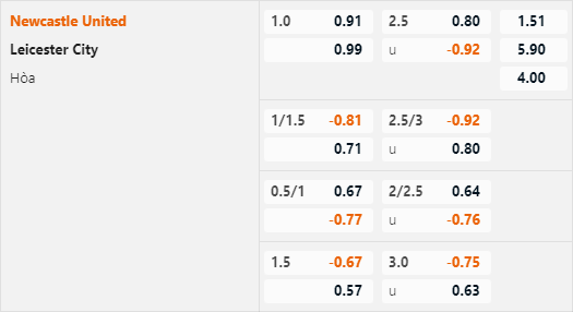 Với lợi thế sân nhà và phong độ tốt hơn các cầu thủ Newcastle đang được nhà cái châu Á đánh giá cao hơn với tỷ lệ chấp 1 hoà trận này. Đây là mức chấp tương đối cao của đội chủ nhà khi trận đấu tương tự gần nhất các cầu thủ Newcastle chỉ có tỷ lệ chấp 2-0. Điều này cho thấy giới chuyên môn đang có phần tin tưởng vào khả năng thắng kèo của Newcastle trận này.